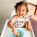 This unique, patent-pending design allows your child to play freely with their food or sensory activities without constricting around their neck like a traditional bib and your tiny tot can't remove it without a grown-up. Less mess for everyone! (It rinses clean in the sink between meals as well, saving you headache and laundry.)